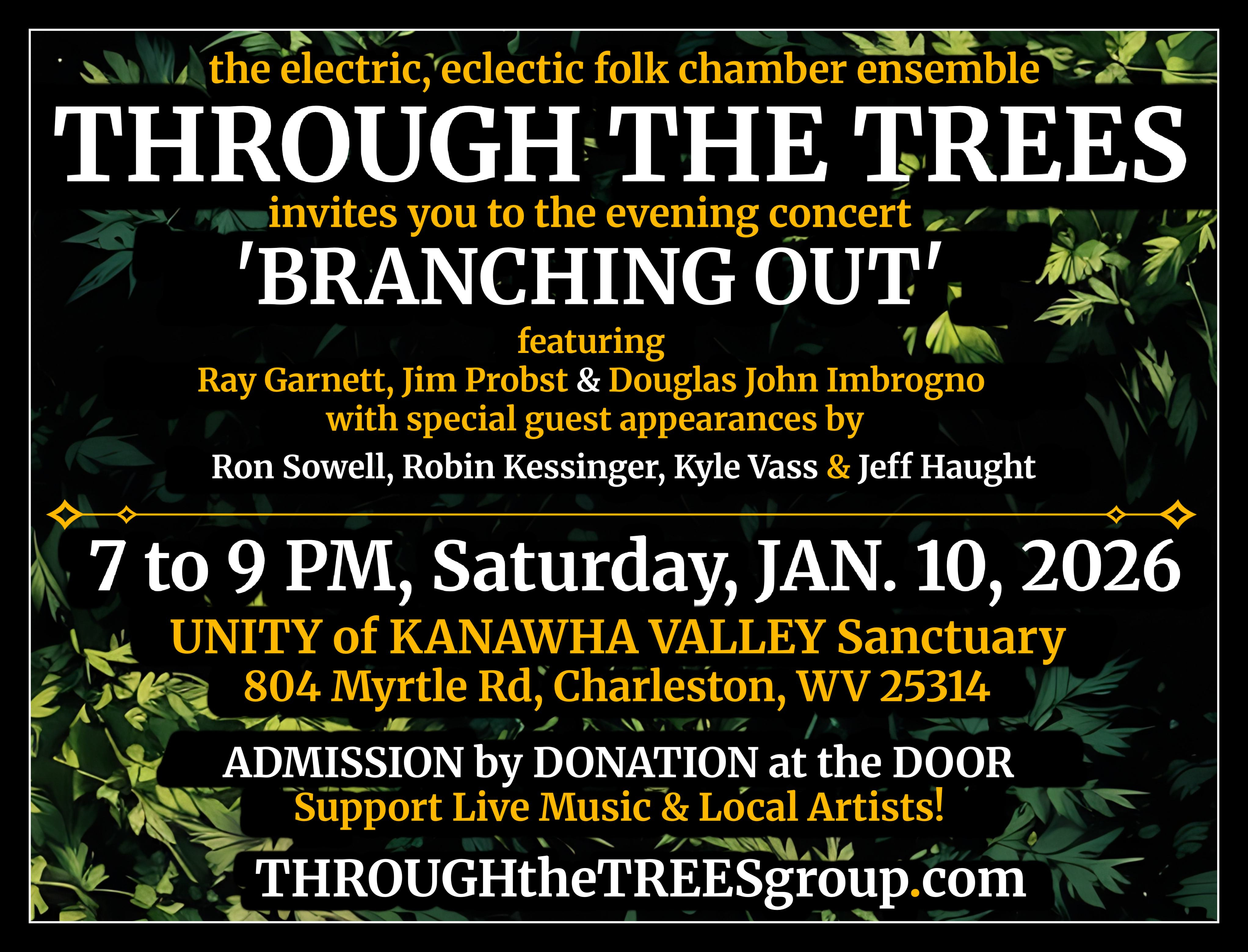 Hear THROUGH the TREES perform ‘Sometimes I Feel Like a Mother Child’ live, along with many other tunes, as the electric, eclectic folk-chamber ensemble hosts the evening concert ‘BRANCHING OUT,’ from 7 to 9 p.m., SATURDAY, JANUARY 10, 2026, in the UNITY of KANAWHA VALLEY upstairs sanctuary, 804 Myrtle Road, Charleston, W.Va., 25314. The concert features ensemble founding members Ray Garnett, Jim Probst, and Douglas John Imbrogno, plus special guest appearances by Ron Sowell, Robin Kessinger, Kyle Vass, and Jeff Haught.