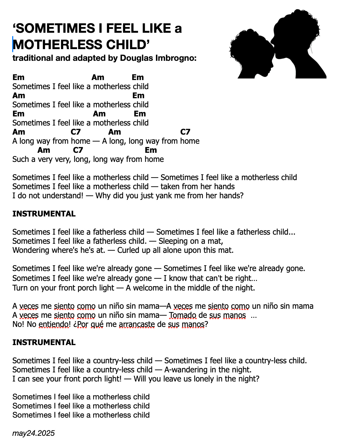 “I first wrote and added my contemporary lyrics to ‘Motherless Child’ in the first Trump administration, angered and moved by images of young people in detention centers, ripped and separated from their parents,” notes Imbrogno. “Of course, everything has gotten far worse in 2025 with the wannabe-autocracy of Trump 2.0. He has super-sized the repression with the injection of more than a billion dollars for his personal junta security force, via the many violent, roving bands of free-range ICE bullies, overseen by Donald’s ready-for-her-closeup factotum Kristi Noem.”